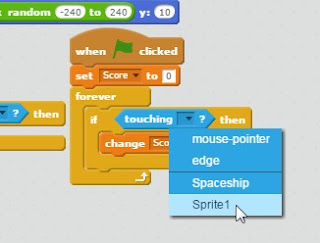 43.Setelah itu kita ke blok 'Sensing' pilih 'touching[]?' lalu masukkan ke dalam masing-masing kata 'if{ }then' ganti 'touching[]?' yang ada di kiri bawah menjadi 'spaceship' lalu ganti juga 'touching[]?' yang ada di kanan bawah menjadi 'sprite1'(sprite peluru)